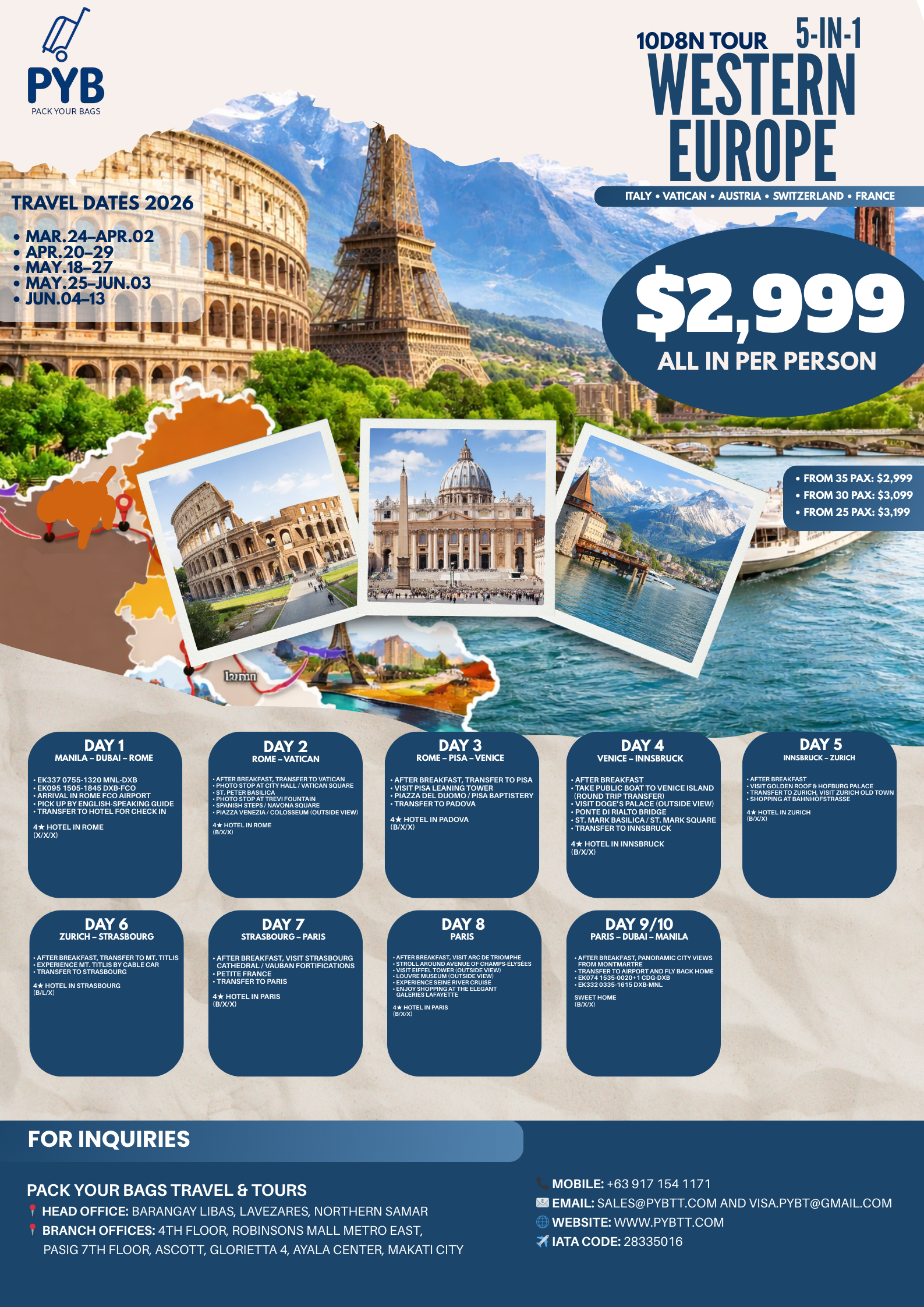 Experience the highlights of Western Europe in one unforgettable 10-day journey. This classic multi-country tour takes you from the ancient wonders of Rome and Vatican City to the romantic canals of Venice, the alpine beauty of Switzerland, the fairy-tale charm of Austria, and the timeless elegance of Paris. Enjoy guided sightseeing, comfortable 4-star hotel stays, scenic transfers, and iconic landmarks—perfect for first-time Europe travelers and dream vacations.