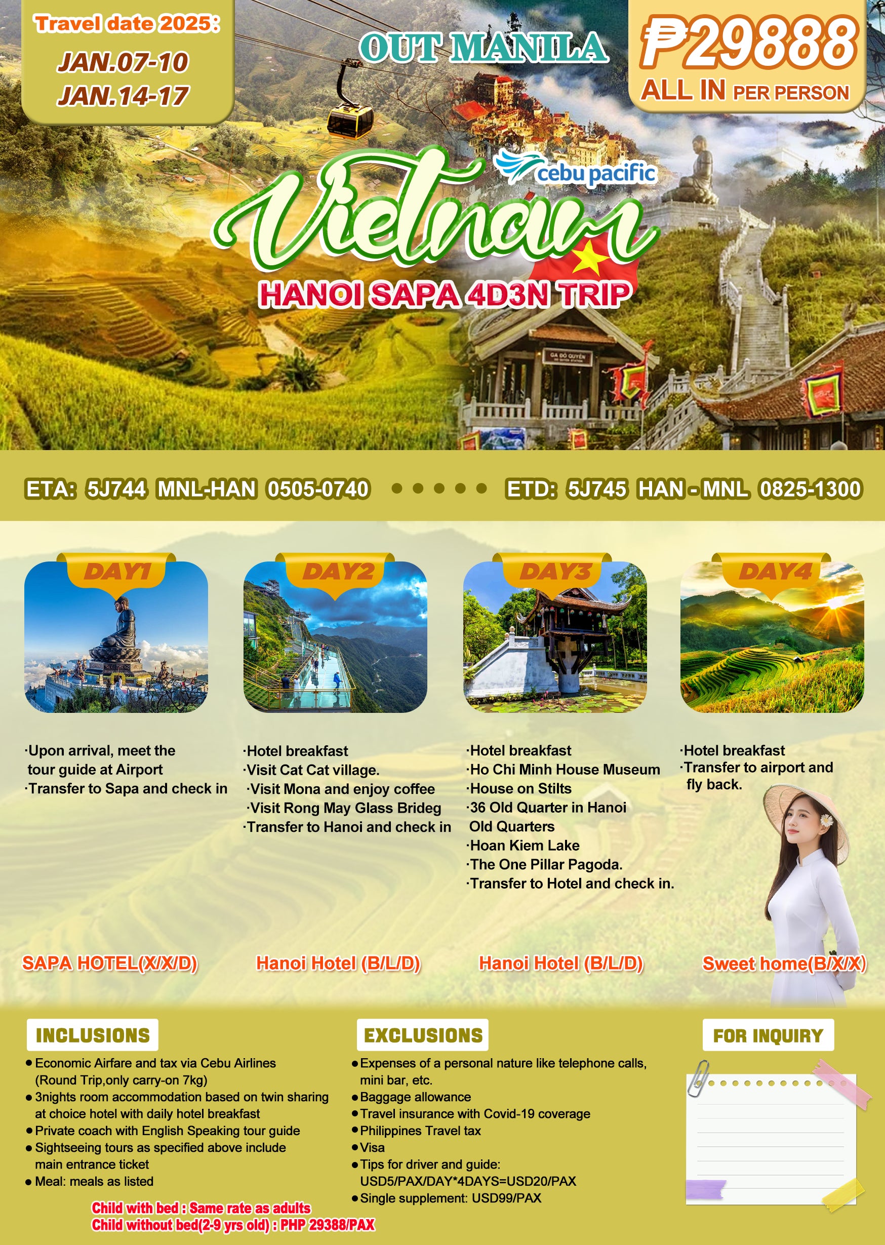 Fly out from Manila and uncover the charm of Hanoi, Vietnam. Step into the picturesque beauty of Cat-Cat Village, a haven of culture and tradition, and explore the rich history of Vietnam at the iconic Ho Chi Minh House Museum.