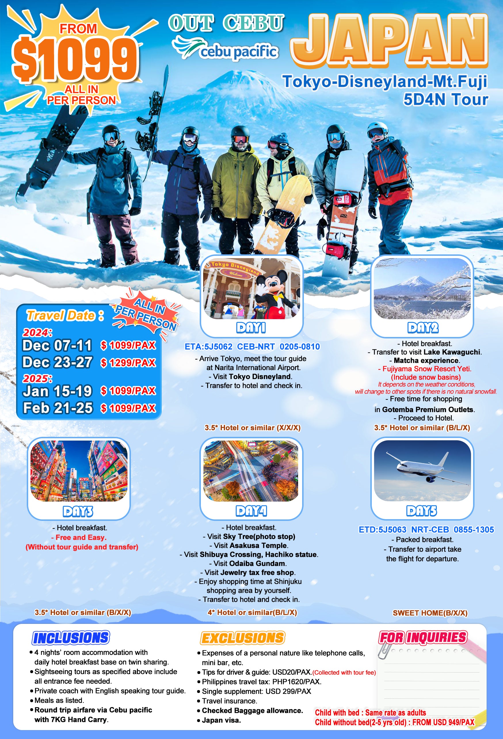Fly out from Cebu and embark on a magical 5-day, 4-night adventure. Explore the bustling streets of Tokyo, immerse yourself in the enchanting world of Disneyland, and marvel at the majestic beauty of Mt. Fuji.