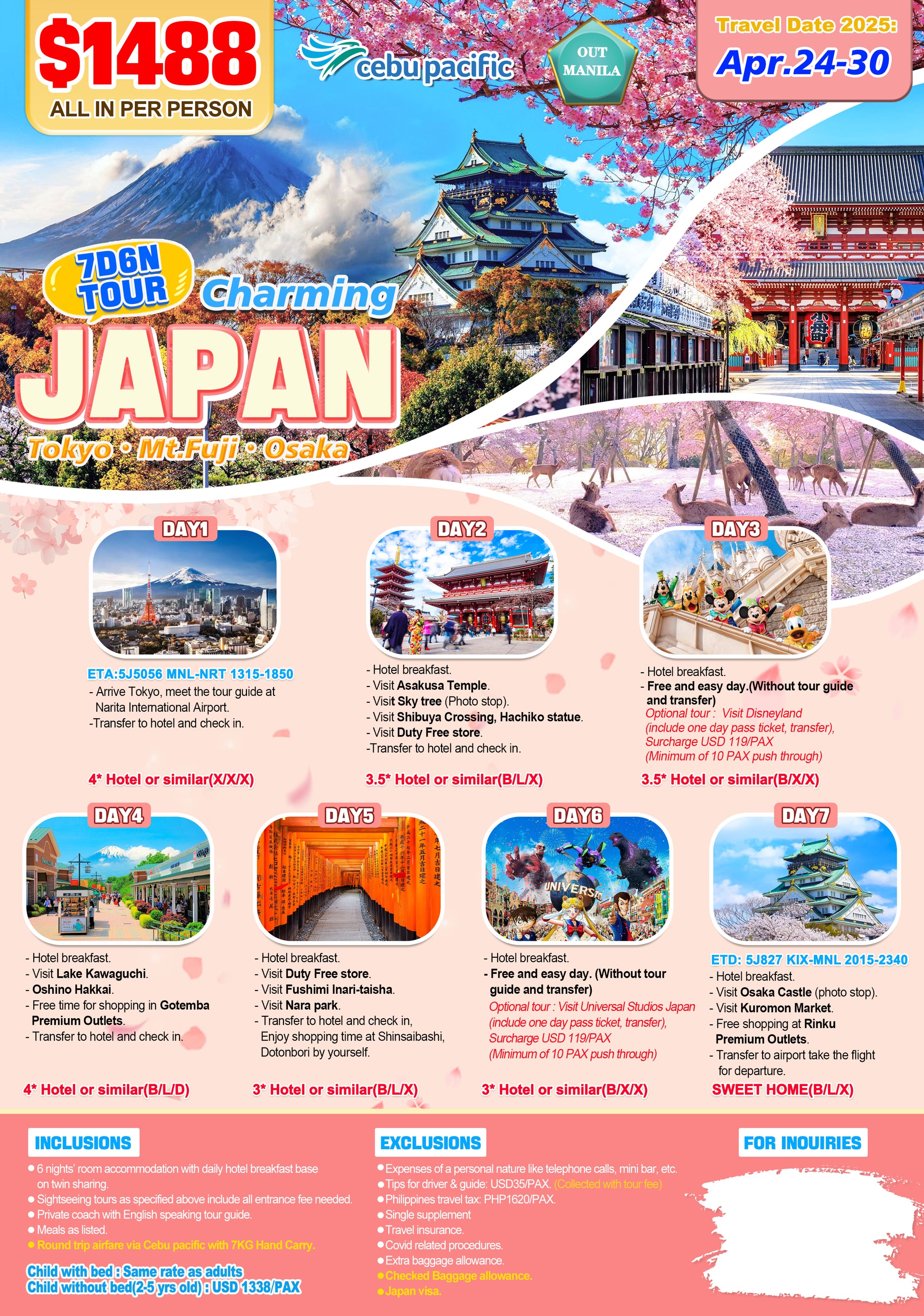 Embark on an unforgettable 7-day, 6-night adventure and explore Japan’s most iconic destinations. Visit the serene Asakusa Temple, marvel at the vibrant energy of Shibuya Crossing, and meet the beloved Hachiko Statue. Bask in the scenic beauty of Lake Kawaguchi, indulge in shopping at Gotemba, and experience the cultural wonders of Nara.