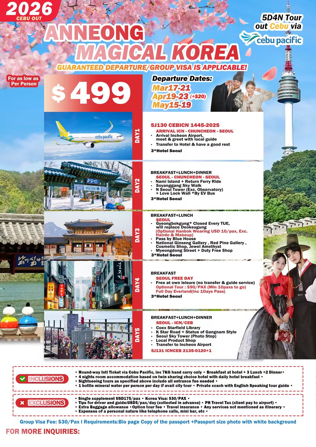 INCLUSIONS ✔ Round-trip international airfare via Cebu Pacific (7kg hand carry only) ✔ 4 nights hotel accommodation (twin sharing) with daily breakfast ✔ Meals as specified: Breakfast + 3 Lunch + 2 Dinner ✔ Sightseeing tours with entrance fees as per itinerary ✔ Private coach during city tours ✔ English-speaking tour guide ✔ 1 bottle mineral water per person per day (city tour days) EXCLUSIONS ✘ Single supplement: USD 175 / pax ✘ Korea Visa Fee: USD 30 / pax ✘ Group Visa Fee: USD 30 / pax ✘ Tips for driver & guide: USD 5 / pax / day ✘ Philippine Travel Tax (client pays at airport) ✘ Extra baggage allowance ✘ Optional tours ✘ Travel insurance ✘ Personal expenses (calls, mini-bar, etc.) ✘ Any service not mentioned in the itinerary