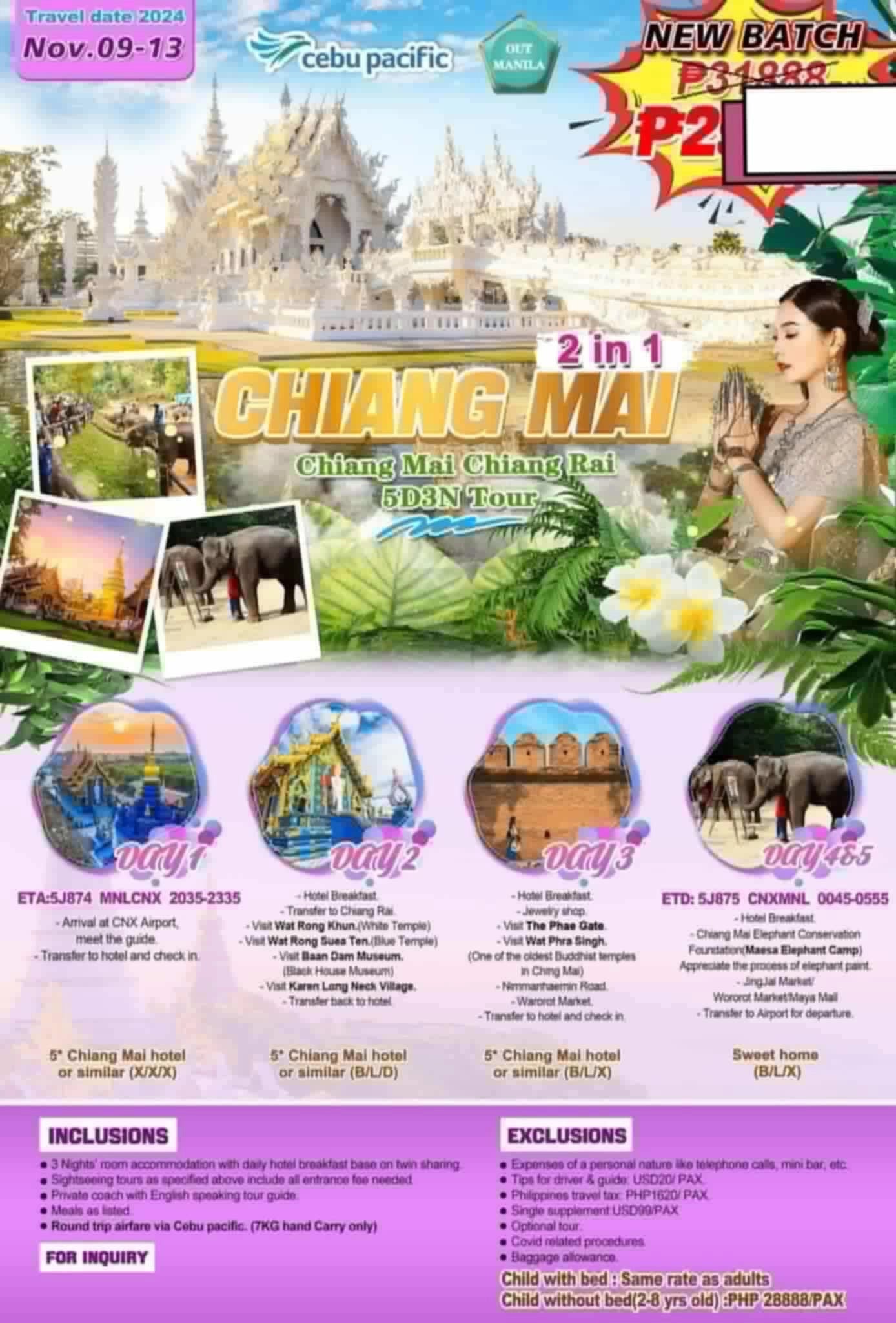 Experience the Magic of Ancient Chiang Mai: 5 Days 3 Nights Tour from Philippines Discover Thailand's cultural heart with our exclusive Chiang Mai tour package from the Philippines. Perfect for both first-time visitors and seasoned travelers, this 5-day adventure lets you explore the best of Northern Thailand's ancient capital. 🏯 Package Highlights: • Visit sacred temples including the iconic Doi Suthep • Authentic Thai cooking class with local market tour • Traditional Thai massage experience • Night bazaar shopping expedition • Ethical elephant sanctuary visit • Local hill tribe village experience ✈️ Package Includes: • Round-trip flights from Philippines • 3 nights' accommodation in central Chiang Mai • Daily breakfast • Airport transfers • Guided tours • English-speaking tour guide • Travel insurance Perfect for couples, families, and small groups seeking a blend of culture, nature, and authentic Thai experiences. Discover why Chiang Mai is called the "Rose of the North" with our carefully curated itinerary. Book now for the best rates! Monthly departures available from Manila.