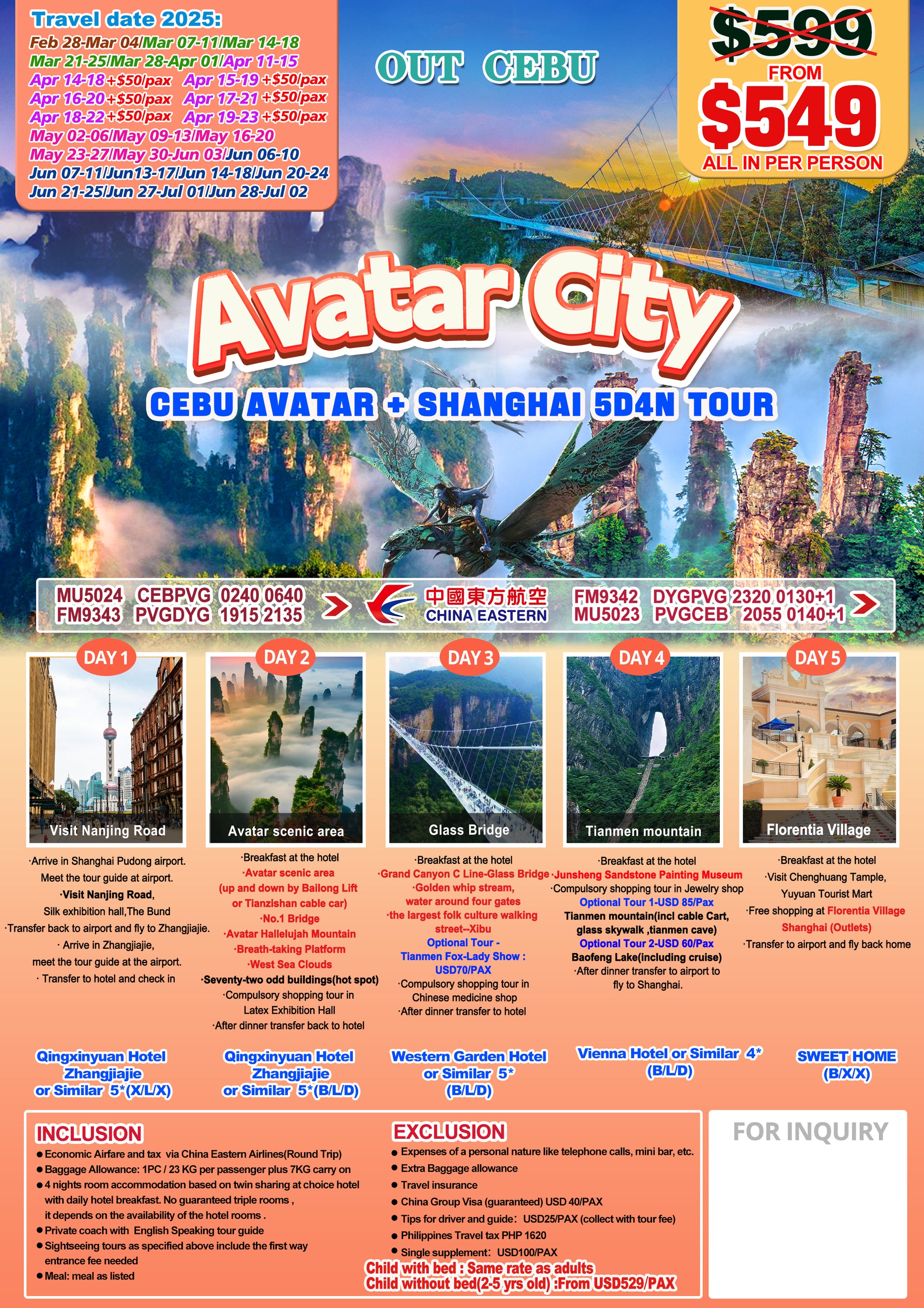 Embark on a breathtaking journey from Cebu to explore the wonders of China. Stroll along the bustling Nanjing Road, marvel at the stunning landscapes of the Avatar Scenic Area, and walk on the thrilling Glass Bridge. Ascend the majestic Tianmen Mountain and indulge in world-class shopping at Florentia Village.