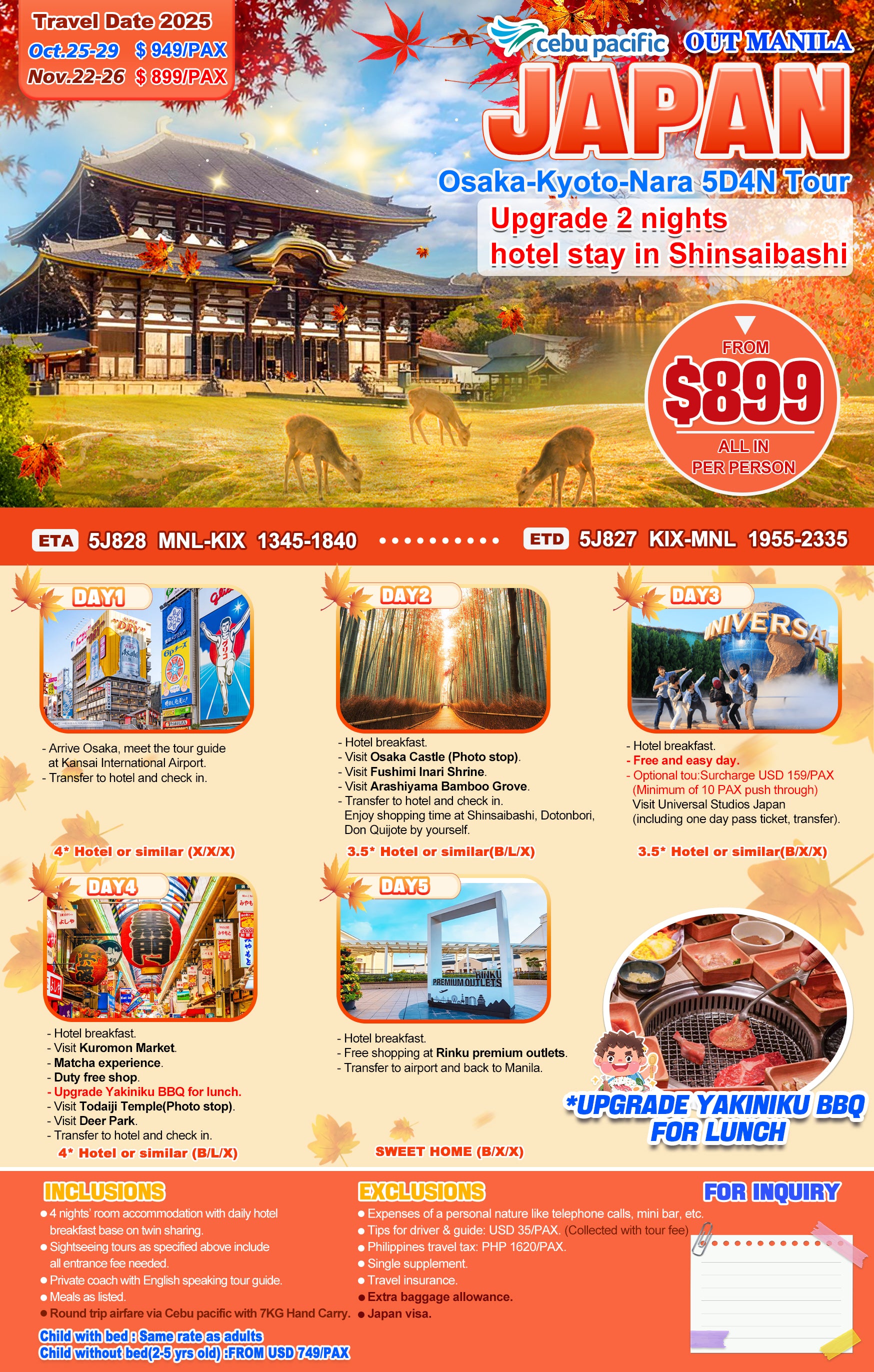 Discover the best of Osaka, Kyoto, and Nara in one unforgettable journey! Snap a photo at the iconic Osaka Castle, dive into local flavors at the bustling Kurumon Market, and enjoy retail therapy at Rinku Premium Outlets. From historic landmarks to vibrant shopping spots, this adventure blends tradition and modern fun.