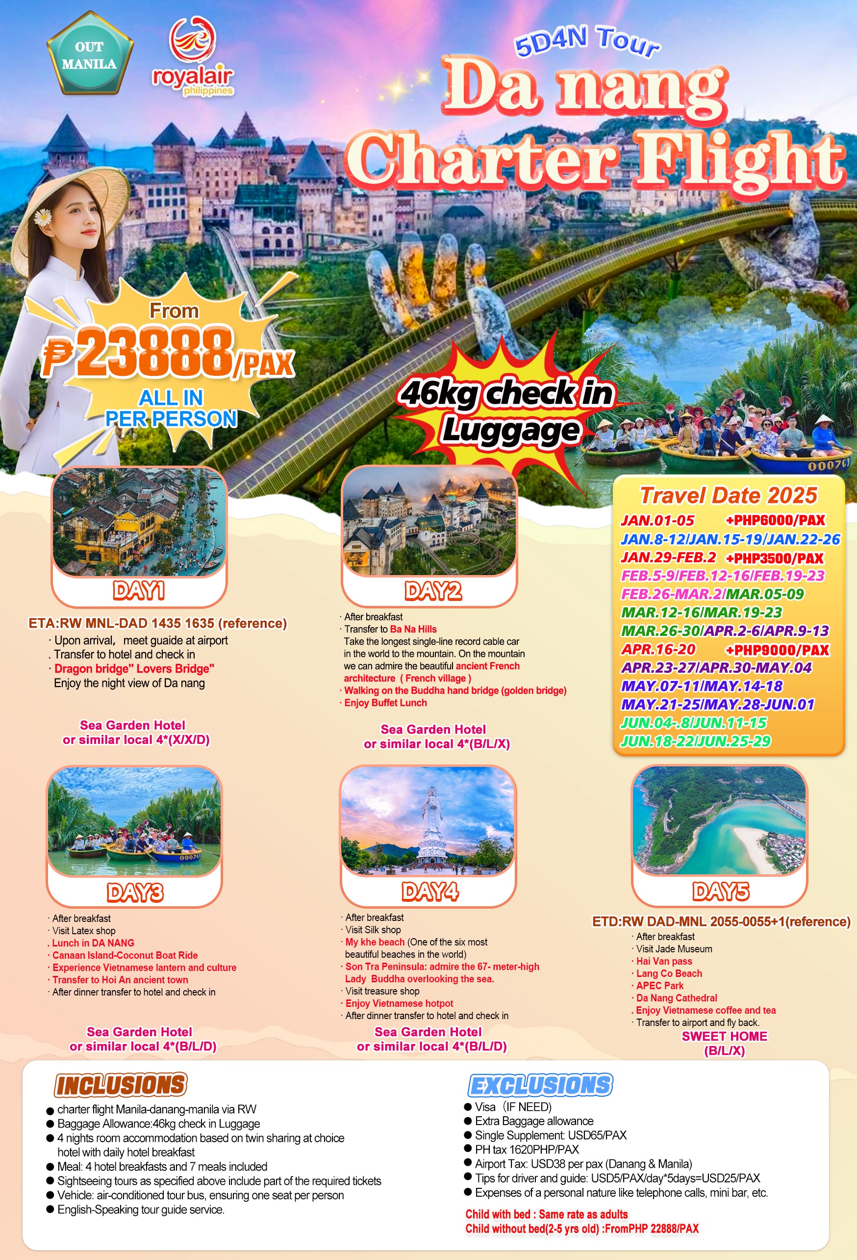 Fly from Manila and discover the captivating charm of Da Nang, Vietnam. Explore the stunning Ba Na Mountain, home to the iconic Golden Bridge, and admire the timeless beauty of the Da Nang Cathedral. Enjoy a fun-filled Coconut Boat Ride at Canaan Island, and take in the breathtaking views of the Son Tra Peninsula.