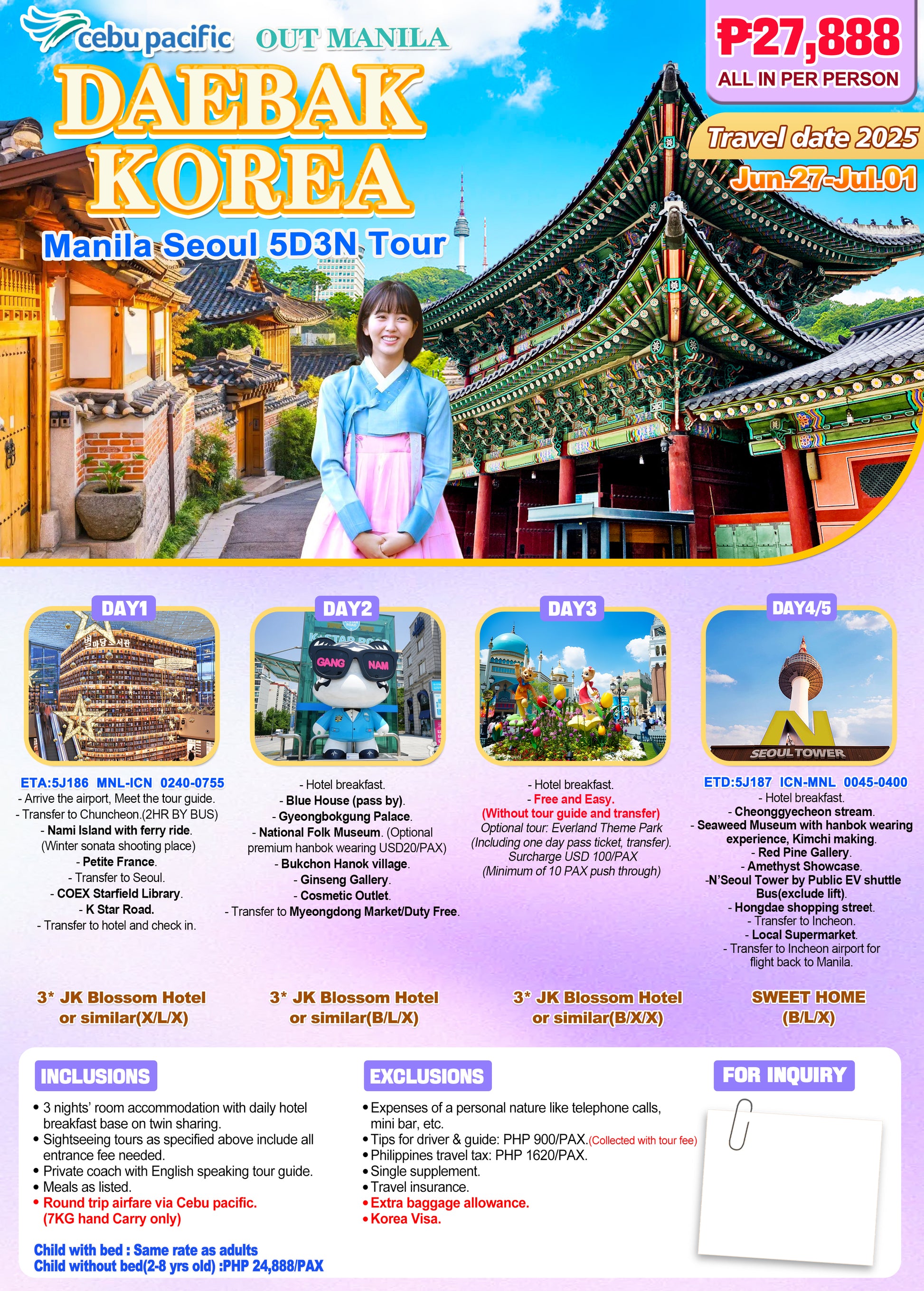 Fly out from Manila and embrace the enchanting charm of South Korea during its vibrant late spring and early summer season. Wander through the scenic beauty of Nami Island with its lush greenery, step into the grandeur of Korea’s history at the iconic Gyeongbokgung Palace, and enjoy a leisurely stroll along the serene Cheonggyecheon Stream, a refreshing urban oasis in the heart of Seoul.