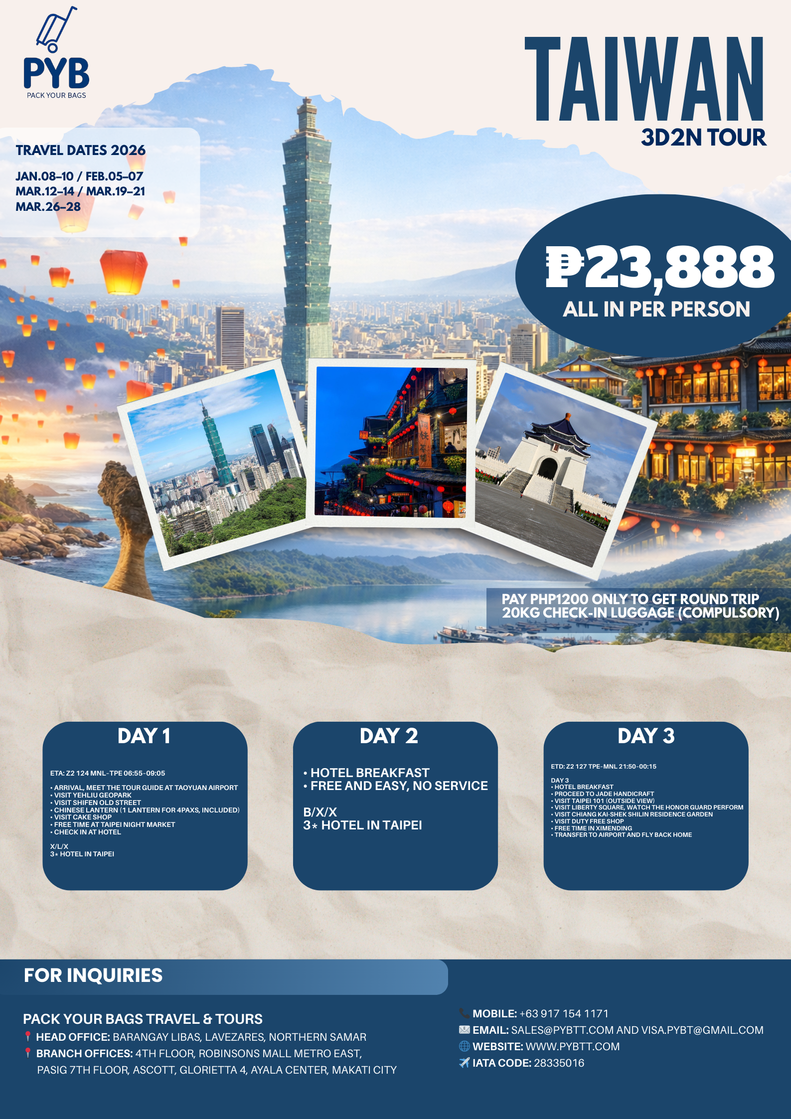 Enjoy a quick yet memorable getaway with this 3 Days 2 Nights Taiwan tour, perfect for travelers who want to experience the highlights of Taipei in a short time. Explore iconic landmarks, cultural streets, traditional crafts, and lively night markets while enjoying comfortable hotel stays and smooth airport transfers. With a mix of guided sightseeing and free time, this tour is ideal for first-time visitors, budget travelers, and those looking for a hassle-free Asian city escape.
