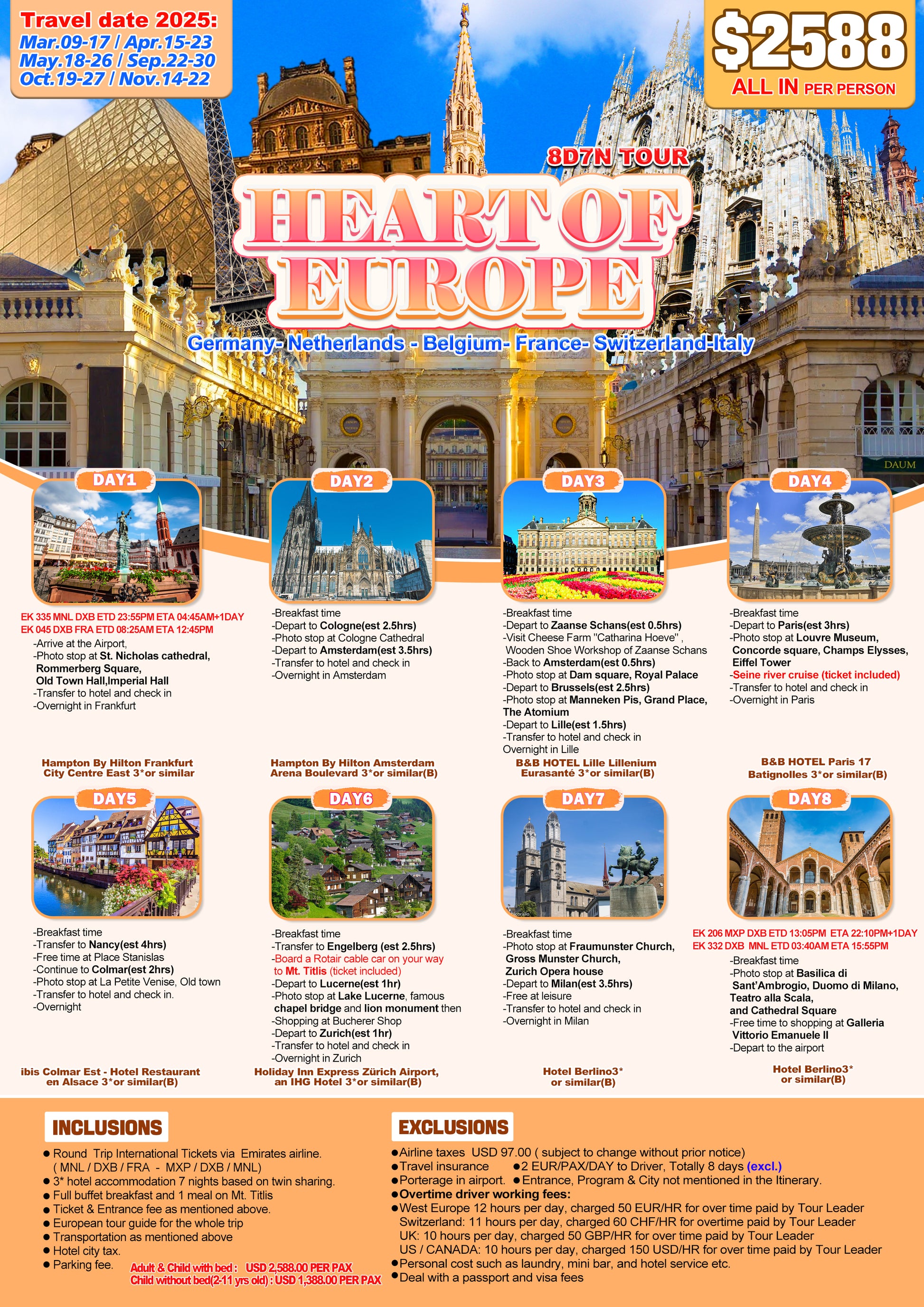 Embark on an unforgettable adventure through the heart of Europe, visiting Germany, the Netherlands, Belgium, France, Switzerland, and Italy. Marvel at the grandeur of St. Nicholas Cathedral in Germany and the charming canals of Amsterdam, with a visit to the picturesque Zaanse Schans. Admire world-famous art at the Louvre Museum in France and soak in the enchanting beauty of Nancy.